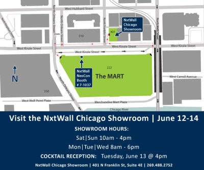 Finally, don’t forget to visit NxtWall’s Corporate Design Showroom in Chicago, to view NxtWall’s new showroom reconfiguration, located in downtown Chicago in the Kinzie Design Center across from the Merchandise Mart, 401 North Franklin, Suite 4E, Chicago, IL 60654. This year Nxtwall has incorporated new wall panel elements and options including our new decorative laminate finishes, new power/data solutions (including Plug-n-Play and conventional electrical construction), new glass door hardware and new surface mounted media. We hope to see you there!